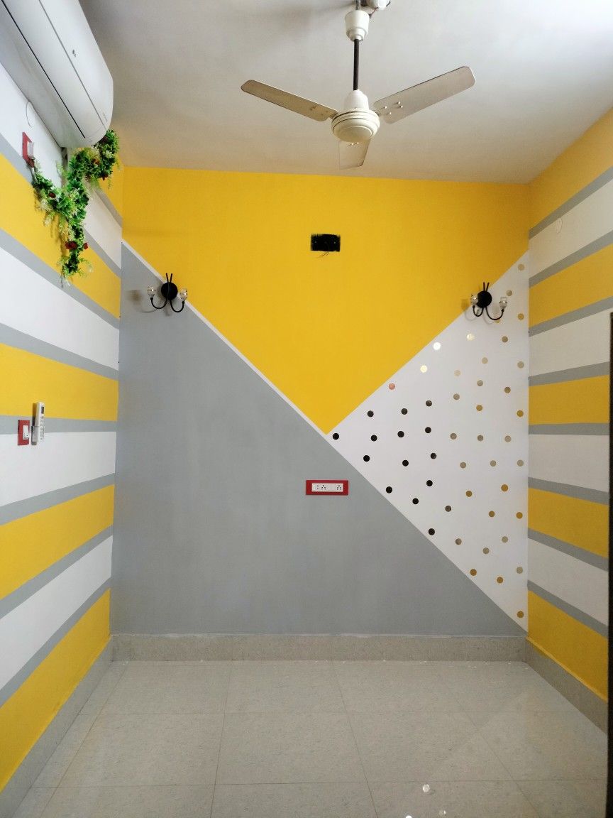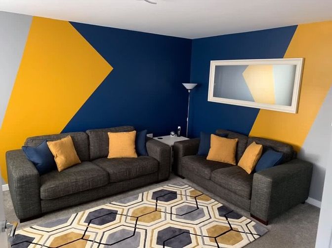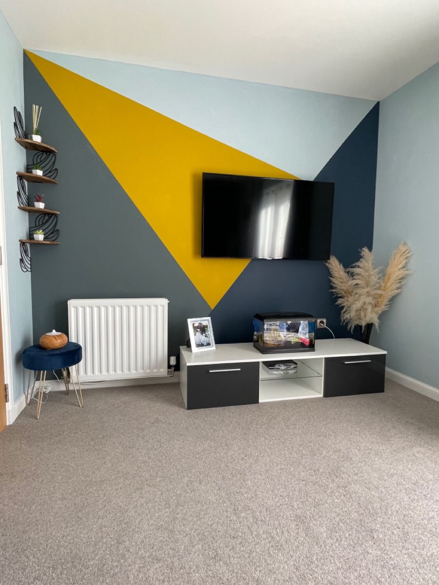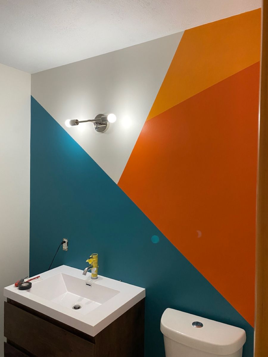 استخدام الشريط اللاصق لتقسيم الجدار بأشكال هندسية ملونة عصرية.